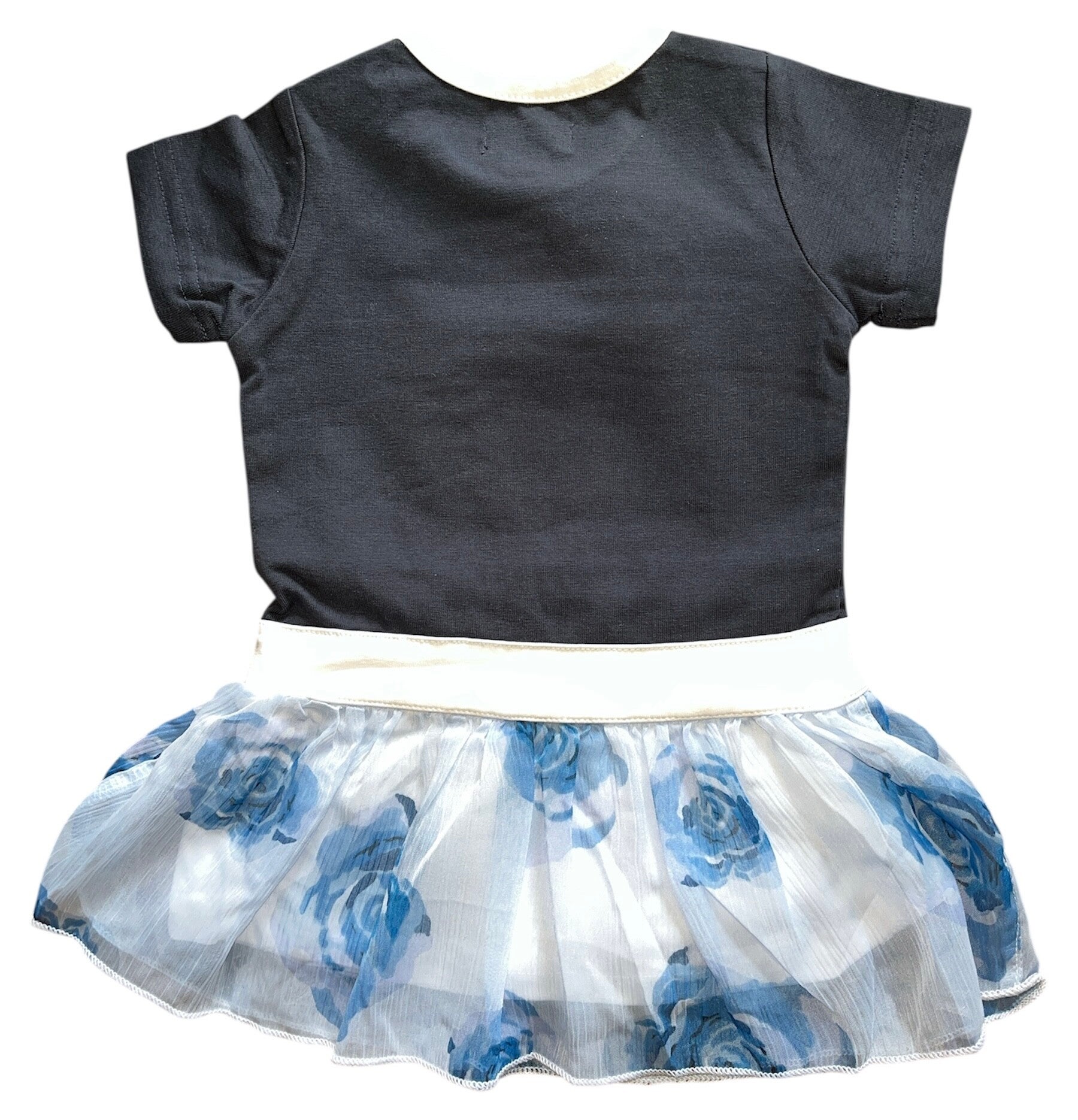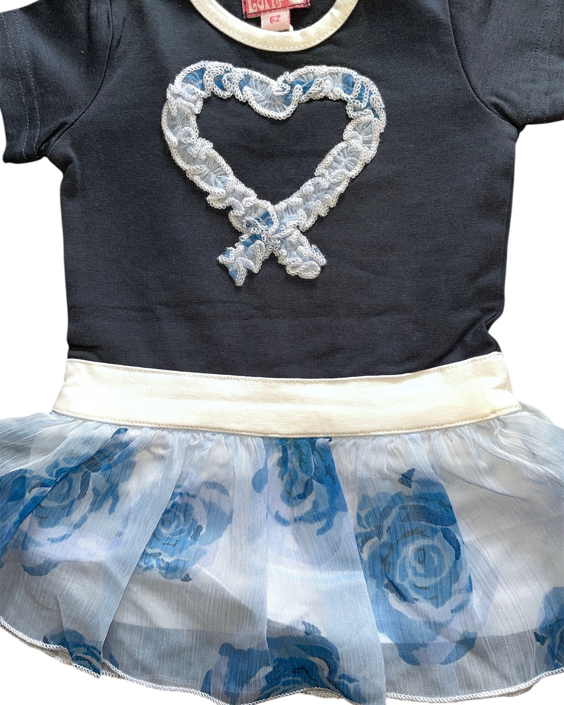 Het bovenstukje is uitgevoerd in donkerblauw met een mooie gehaakte hartapplicatie, en de rok heeft een luchtige witte laag met blauwe bloemenprint voor een speelse en lieve uitstraling.