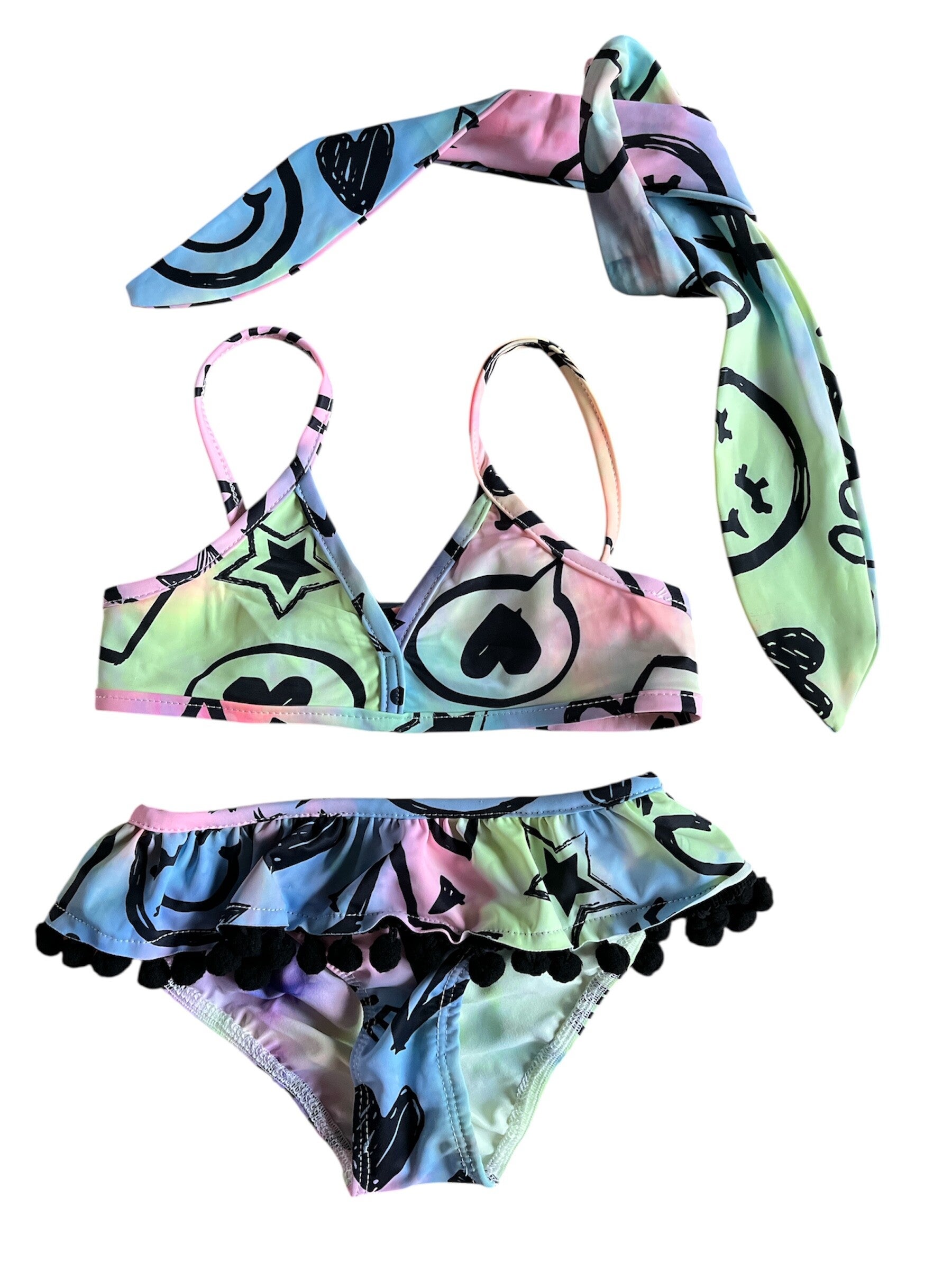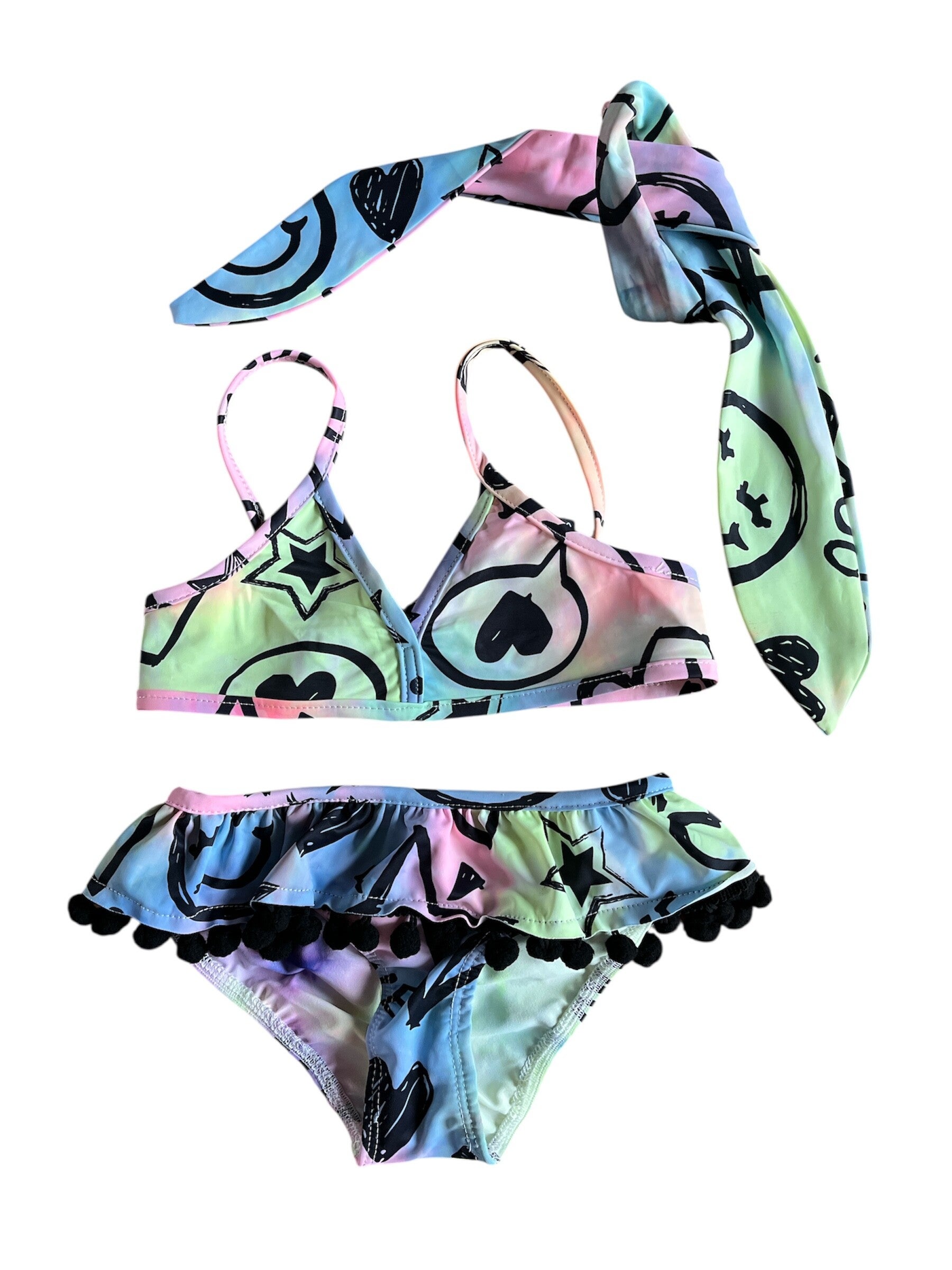 Superleuke kleurrijke bikini van Chicaprie met bijpassende haarband. Het setje heeft een vrolijke pastelprint met sterren en hartjes. Het bikinibroekje is afgewerkt met een schattig roezelrandje en zwarte pompons. Perfect voor zomerse dagen en strandvakanties!
