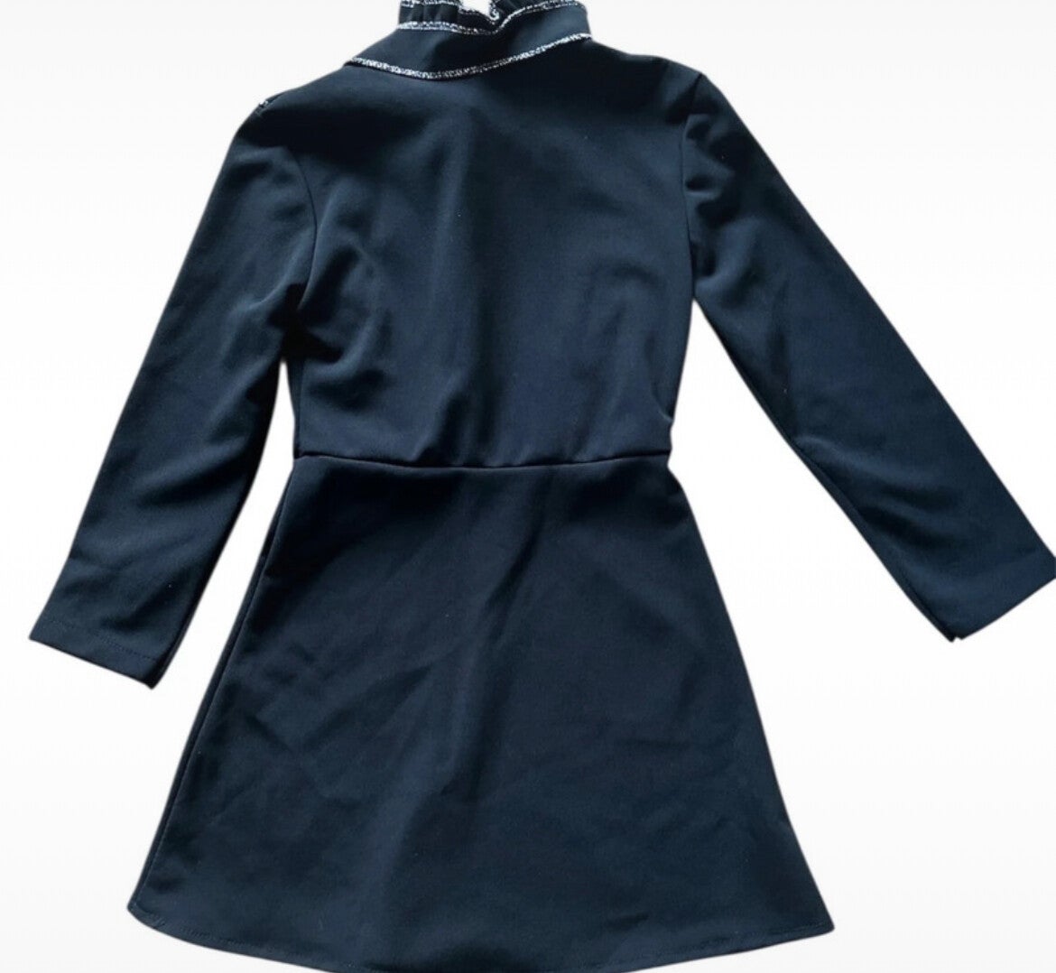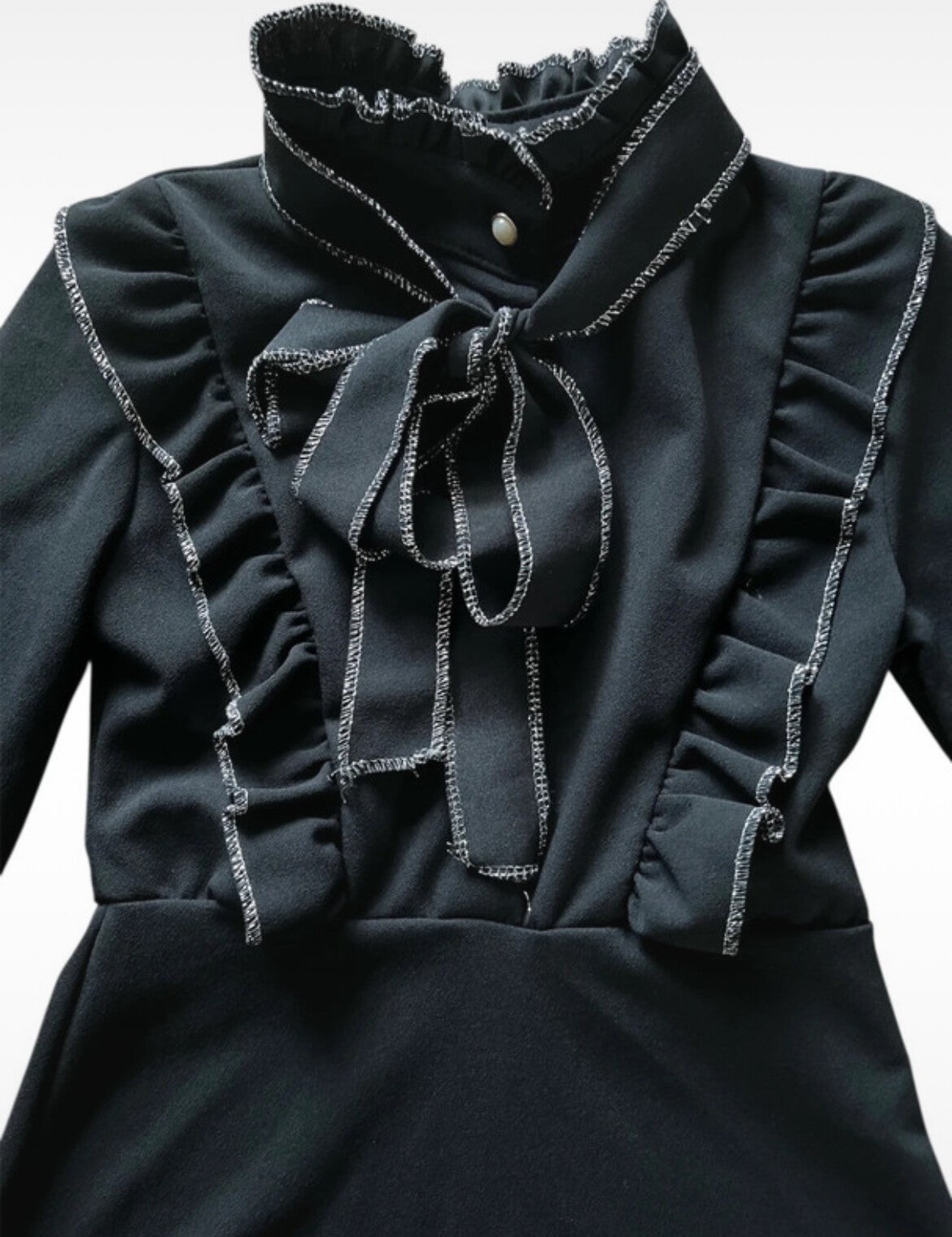 Chic zwart jurkje met lange mouwen, een elegante strik bij de hals en gerimpelde volants met subtiel zilverkleurig randje.