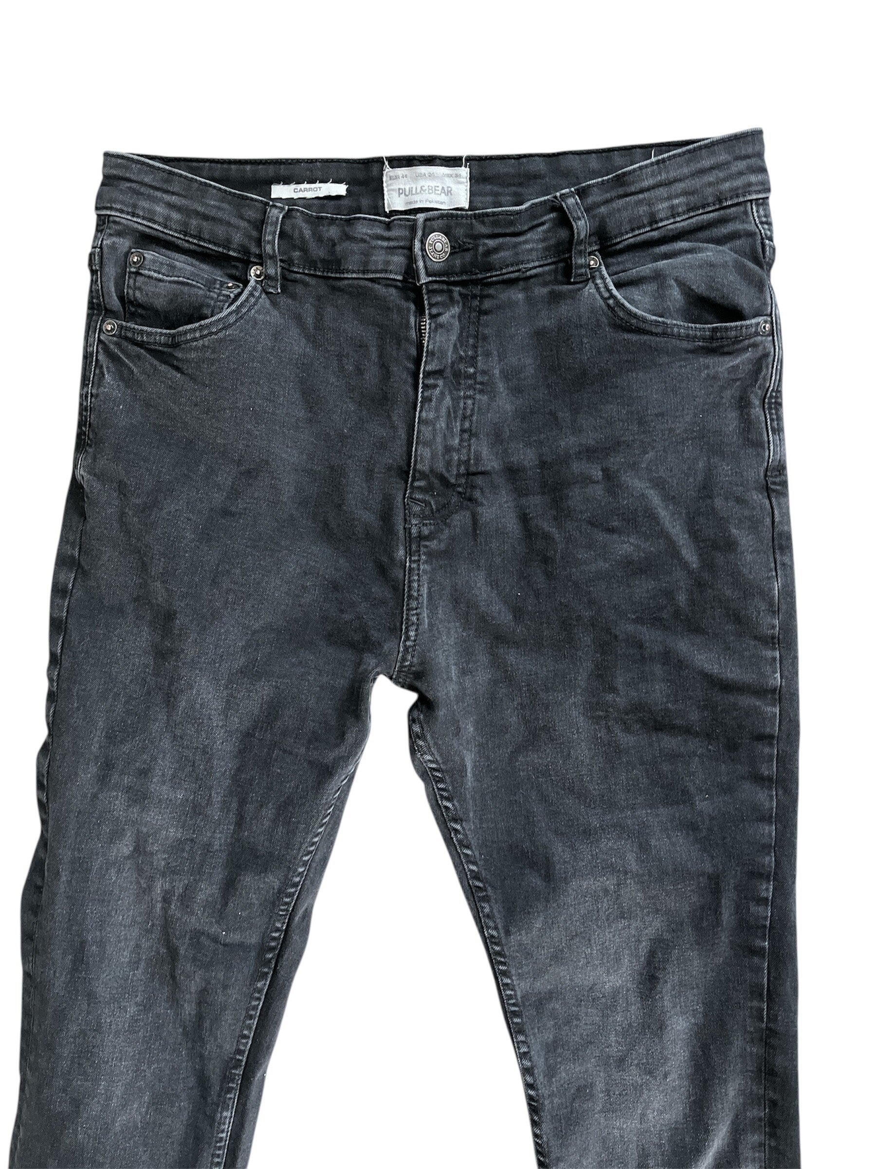 Zwarte spijkerbroek. Carrot. Maat 44. Pull & Bear. Taille breedte ongeveer : 42 cm. Lengte ongeveer : 98 cm.